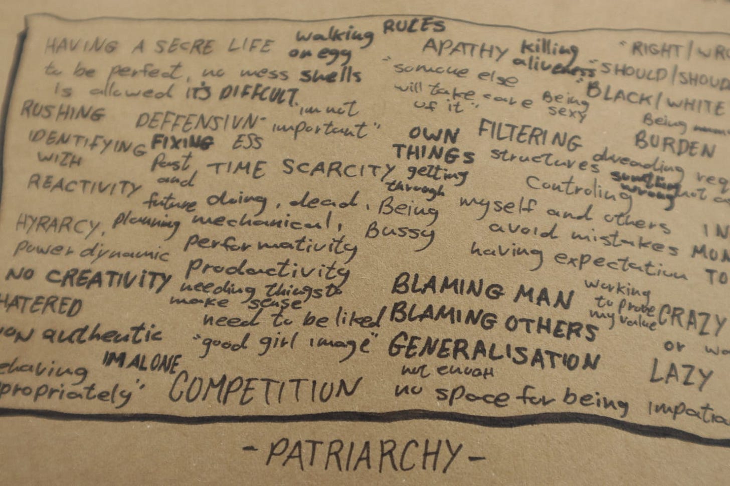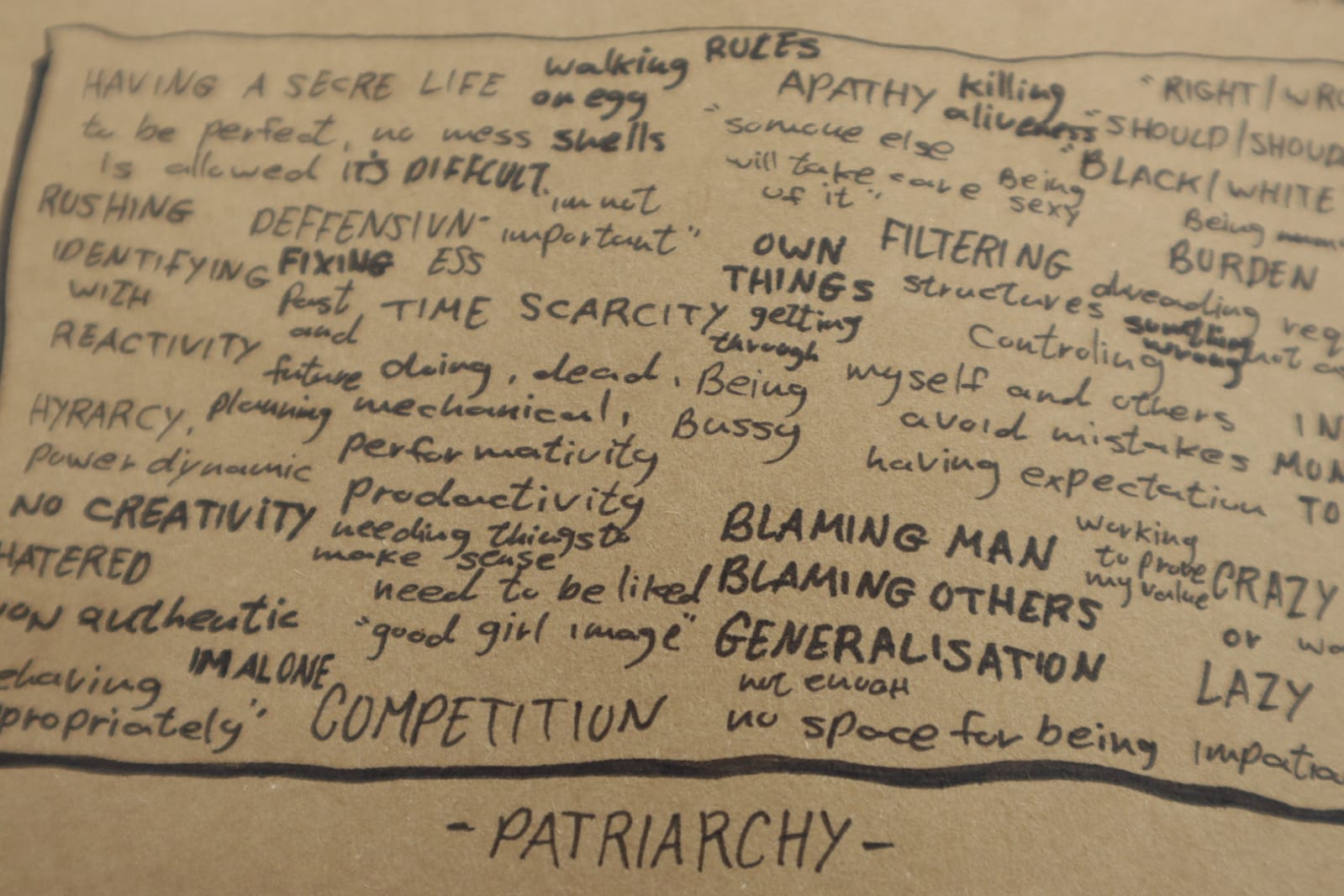 We created a map, full to the brim, with all the ways the patriarchy lives inside us, exists between us. A line of tape was laid on the floor. The invitation was to cross to the other side and commit to a different reality.